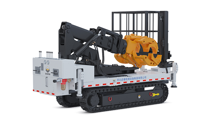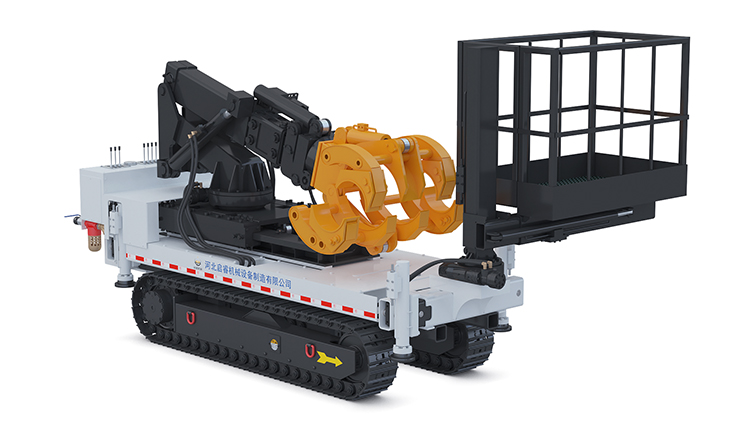 一机多用,可抓举安装、如瓦斯抽放管、各规格水管、高压风管等。当安装瓦斯抽放管时,控制阀控制左右侧支腿伸缩与顶紧,抓臂油缸下翻进行抓管操作,抬升油缸启动开始上翻,爪头将管道抬起保持水平位置,主臂上抬将管道举起到指定安装位置,依据安装位置可适当调整工作面横移量,回转支撑可调整管道的水平与垂直自由度,确保准确安装位置。安装完毕后上升油缸完全收缩,水平油缸完全收回,回转支承旋转至车体正前方,行走至下一安装点。