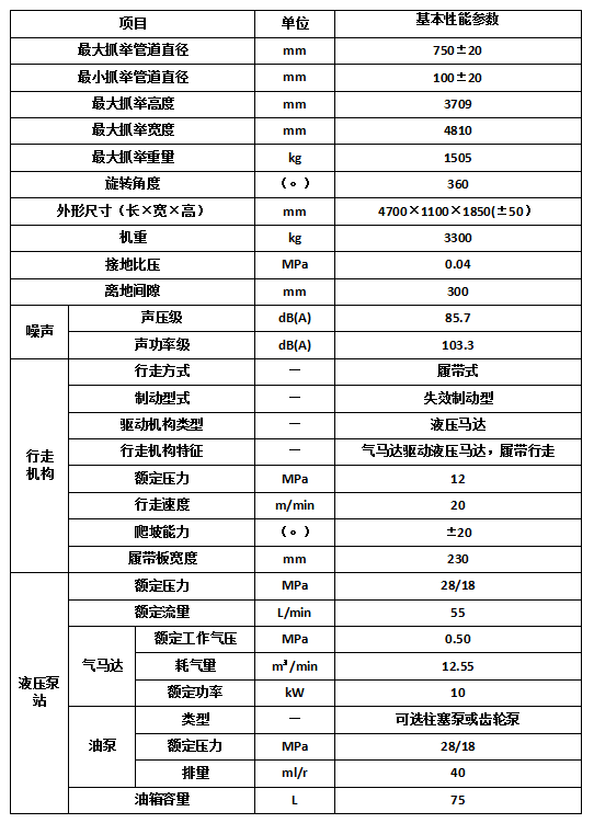 抓举车功能包含动作抓、动作抬、动作举、动作靠等操作,抓机滑台纵向移动量达600mm,两个回转支承提供水平与垂直旋转自由度,使管道靠近安装位置;